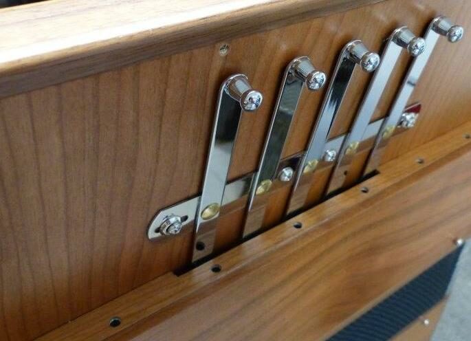 Avec 3 voix à la main droite dont deux en caisse de résonance il est équipé de 7 registres aux sons très marqués.