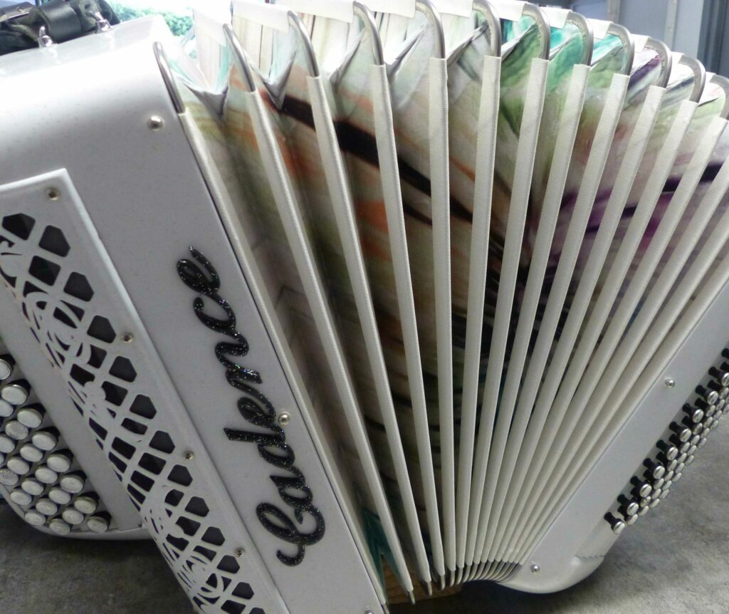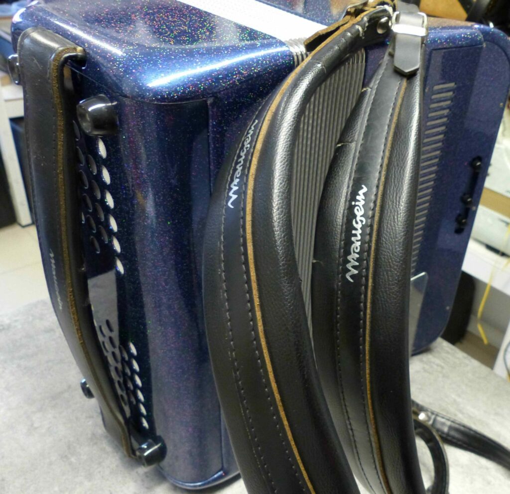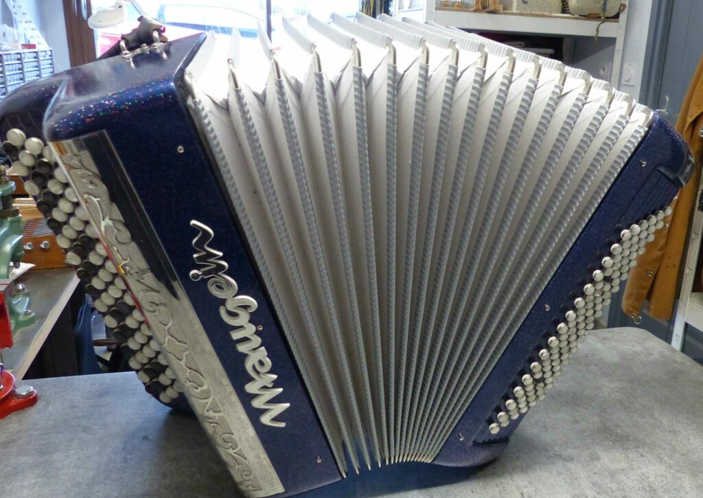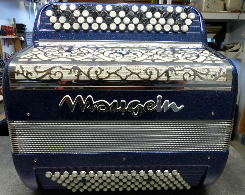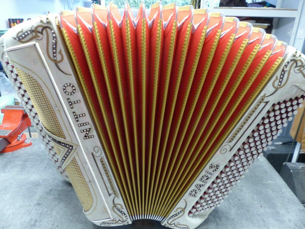 Peaux musiques refaites, soufflet neuf, feutres boutons neufs, courroie main gauche et bretelles neuves.