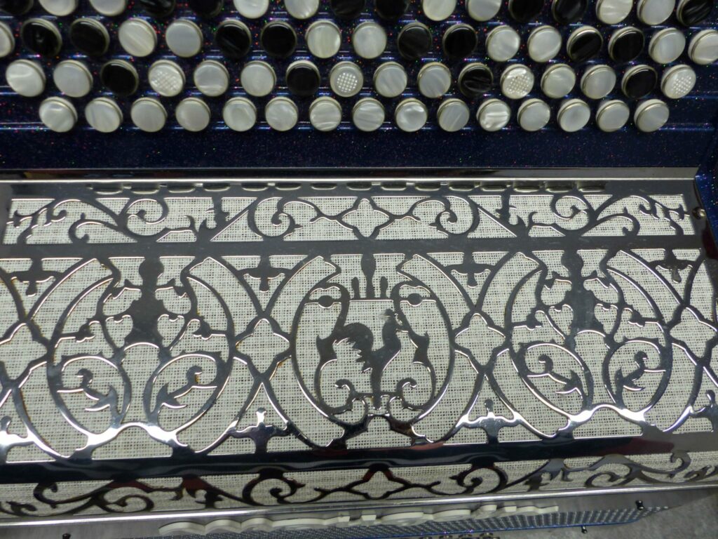 Main droite : 50 notes et 82 touches sur 5 rangs, 3 registres, 3 voix musette.