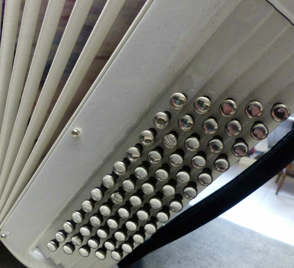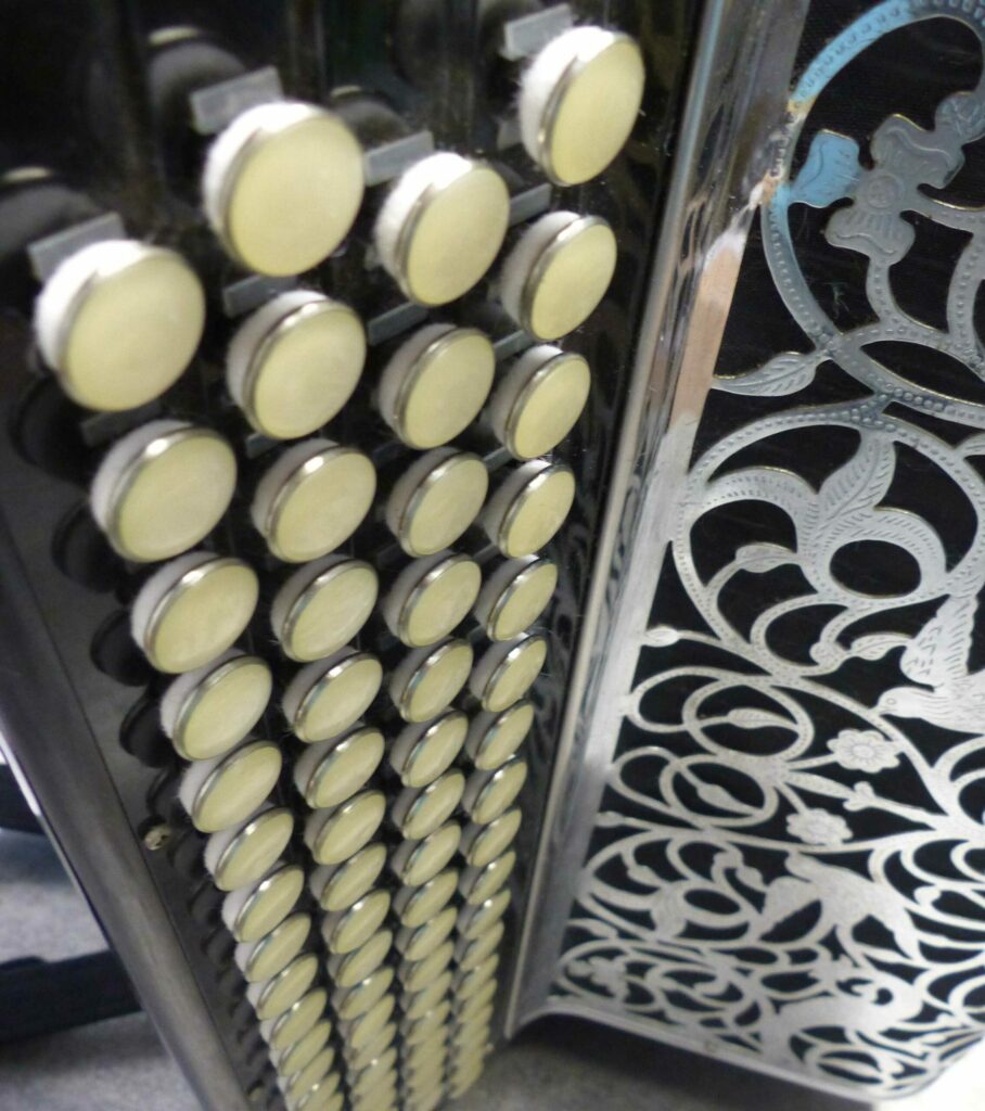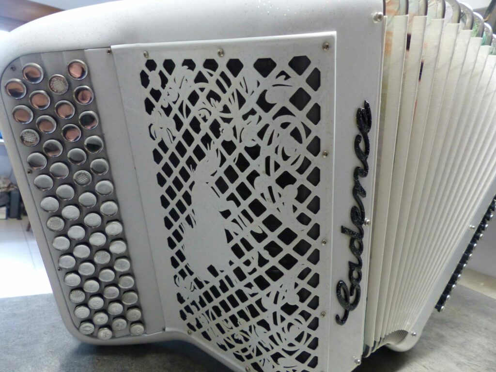 Main droite : 40 notes et 54 touches sur 4 rangs, 3 voix musette, 3 registres.