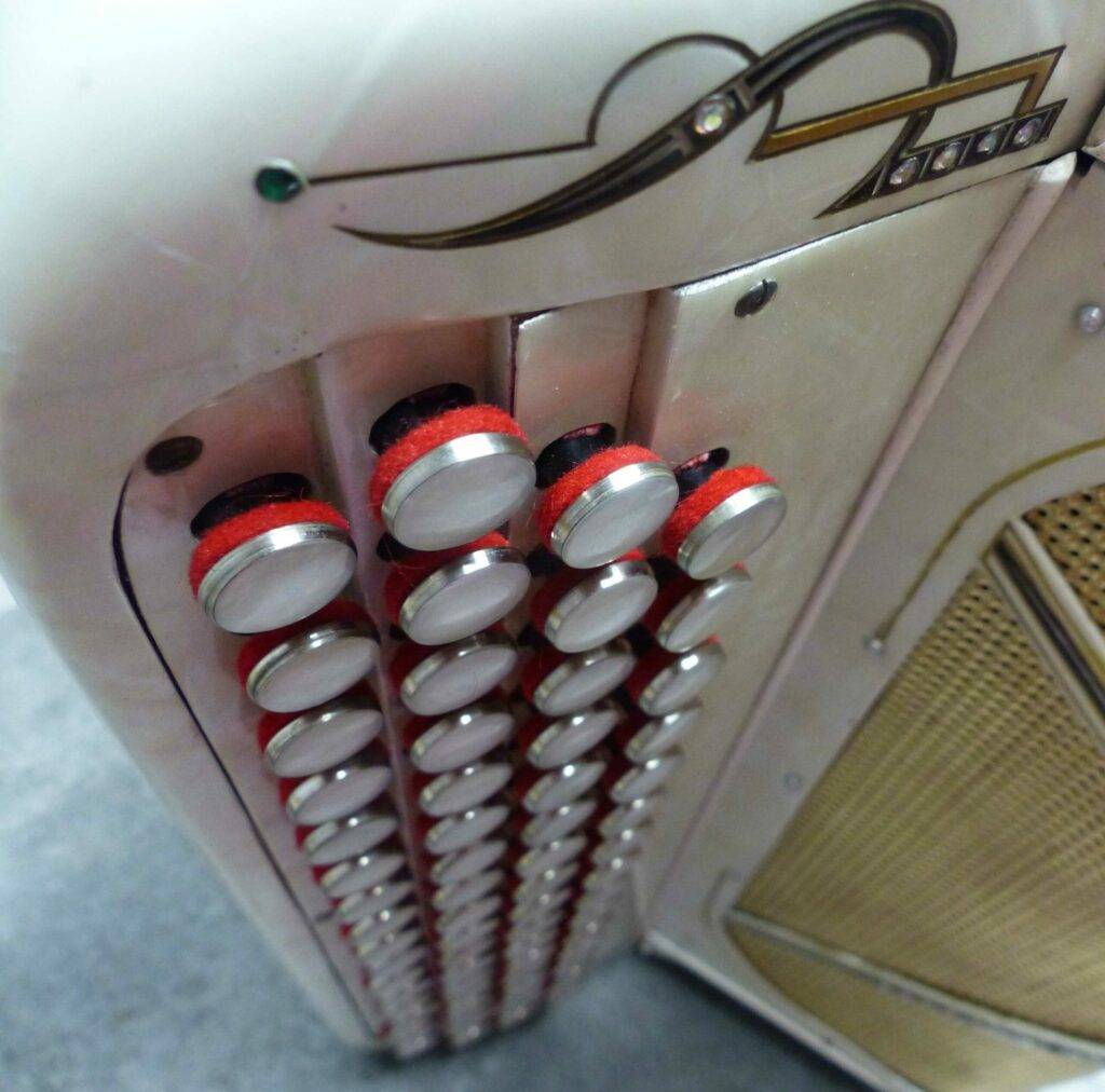 Clavier Peguri, 40 note main droite et 33 main gauche. Boutons en galalithe avec finition nacre véritable. Le soufflet comporte trois plis supplémentaires (un sur chaque tiers) pour une ouverture plus ample.